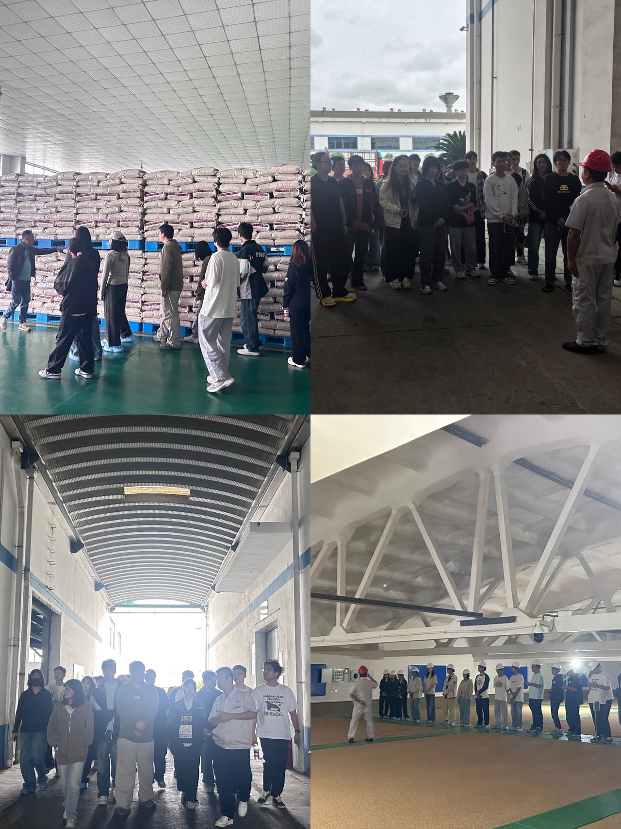在大米供应基地,同学们首先聆听了企业负责人对粮食仓储管理、全流程质检体系的详细介绍。步入现代化粮仓,整齐码放的粮食分区存储区映入眼帘,工作人员详细介绍智能温湿度调控、绿色虫害防治等标准化储粮措施,展现 “每一粒米都在安全环境中保存” 的管控细节。