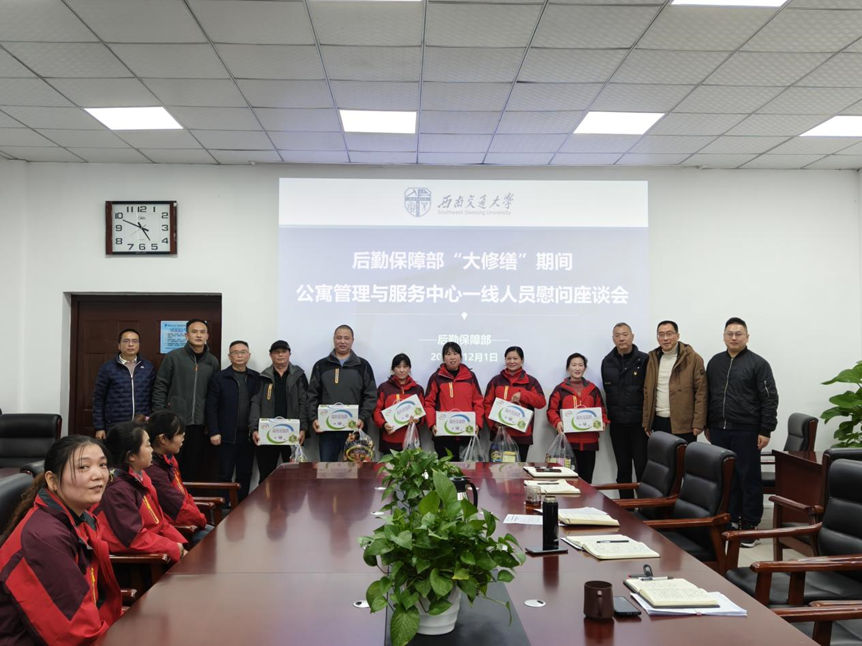 当前学校“大修缮”工作正处于攻坚冲刺的关键阶段,公寓管理与服务中心一线员工始终坚守岗位、履职担当,在保障学生住宿卫生环境、维护公寓园区正常秩序、协同推进修缮工程高效落地等方面付出了辛勤汗水与坚实努力。为切实倾听一线心声、破解工作难题、传递组织关怀,12月1日下午,后勤保障部专题组织召开“大修缮”期间公寓管理与服务中心一线人员慰问座谈会,并对后勤服务平台工作人员进行走访慰问。会议由后勤保障部党委副处级组织员刘勇主持,后勤保障部覃维书记、李煜宏副书记、后勤保障部工会成员参与,与公寓员工面对面交流座谈。
